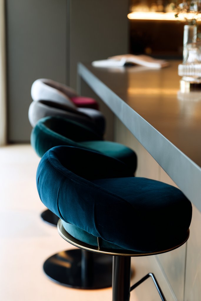 9. Modern, ergonomic bar stools with luxe upholstery for casual dining areas