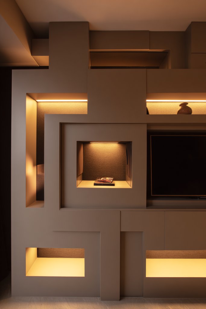 Imagine a series of staggered, multi-tiered recessed shelves or niches carved into the wall. Some hold electronics, while others display decorative objects or subtle lighting fixtures. Hidden LED strips illuminate each level, casting gentle glows and emphasizing the layered design. This setup creates a dynamic, three-dimensional effect that draws the eye and adds visual interest.