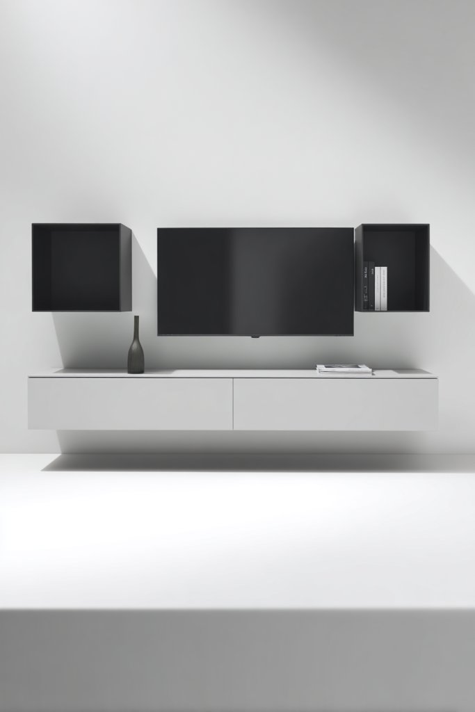 Imagine a slim, wall-mounted TV set against a backdrop of floating shelves that seem to hover effortlessly. The shelves are made of sleek wood or metal, holding decorative items, speakers, or even tech gadgets. The overall look is light, clean, and uncluttered, with open space around it that breathes life into your room. Soft lighting beneath the shelves adds a warm glow, highlighting your carefully curated accessories.