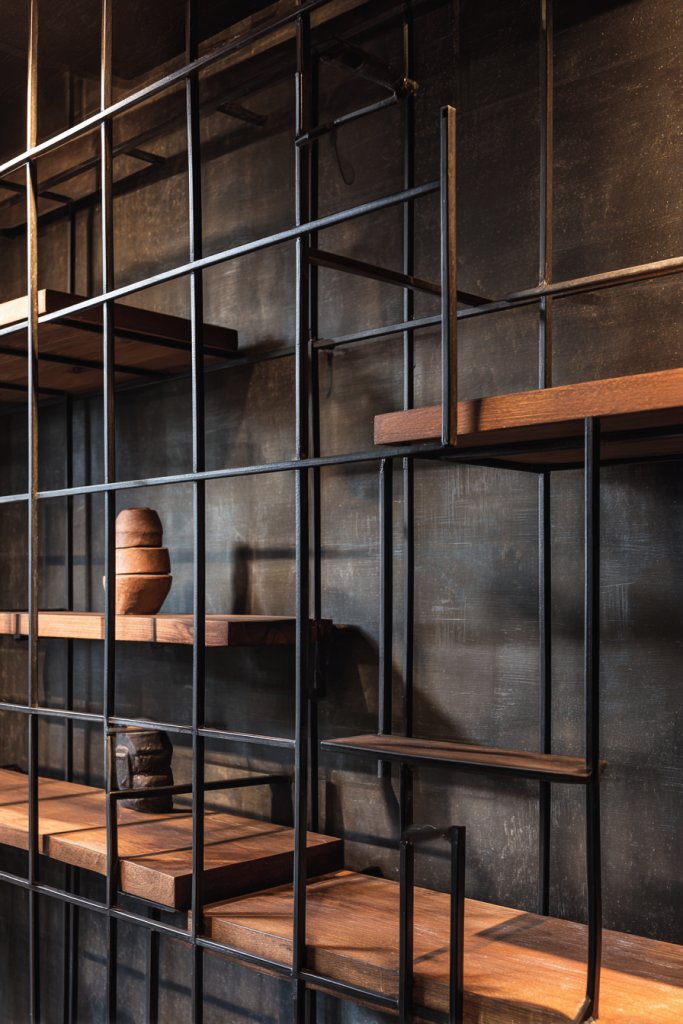 Visualize a sturdy black metal framework forming a geometric grid, with warm-toned wooden planks inserted as shelves. The metal’s matte finish contrasts beautifully with the natural grain of the wood, creating a rugged yet elegant look. The open shelves display media devices, books, or decorative objects, while the frame adds structure and visual interest. When paired with dim, warm lighting, it feels inviting and stylish.