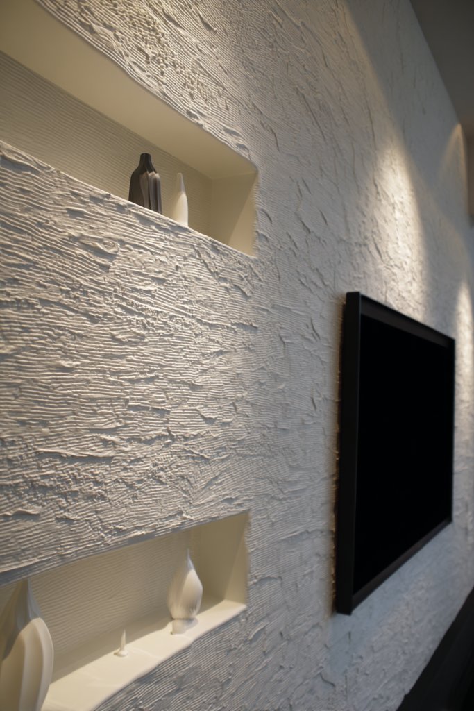 Imagine a wall finished with stucco, textured paint, or textured wallpaper that adds depth and character. Embedded shelves are cut into or mounted flush with the textured surface, holding electronics or decorative objects. When lit subtly, the textured surface casts shadows that change with the light, creating a dynamic, living canvas. It’s a tactile, visual upgrade that transforms your space into a work of art.