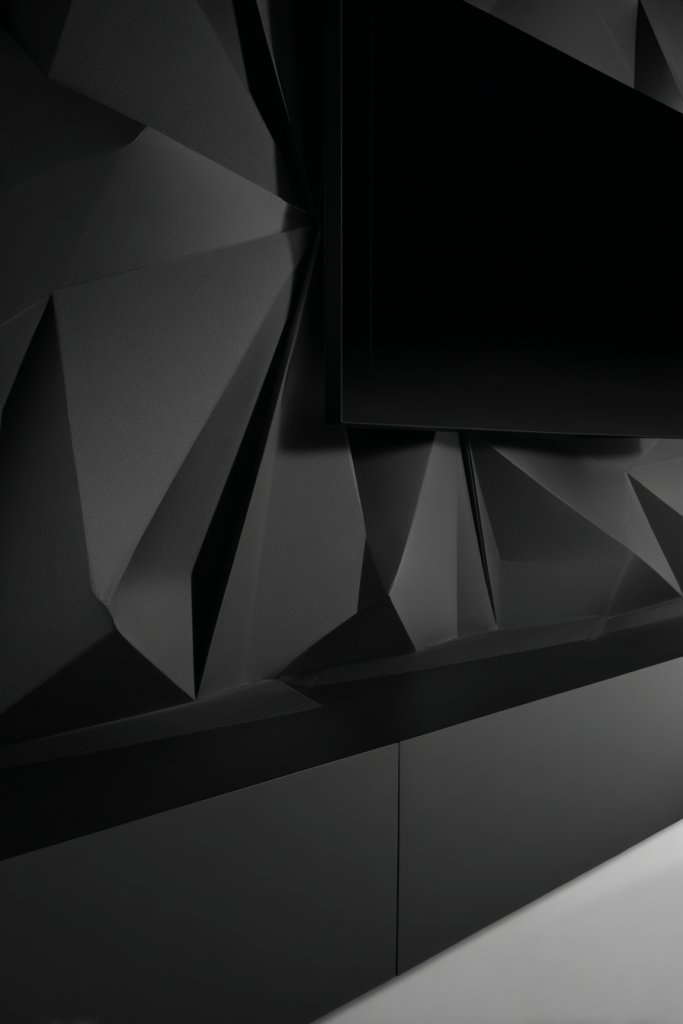 Visualize a wall covered in three-dimensional panels forming striking geometric patterns. The panels come in various materials like MDF, wood veneer, or even textured plastic, painted in contrasting or monochrome shades. The interplay of light and shadow on the textured surface adds drama, especially when illuminated by subtle wall sconces or hidden LEDs. The overall effect is a sophisticated, almost sculptural piece of art built into your room.