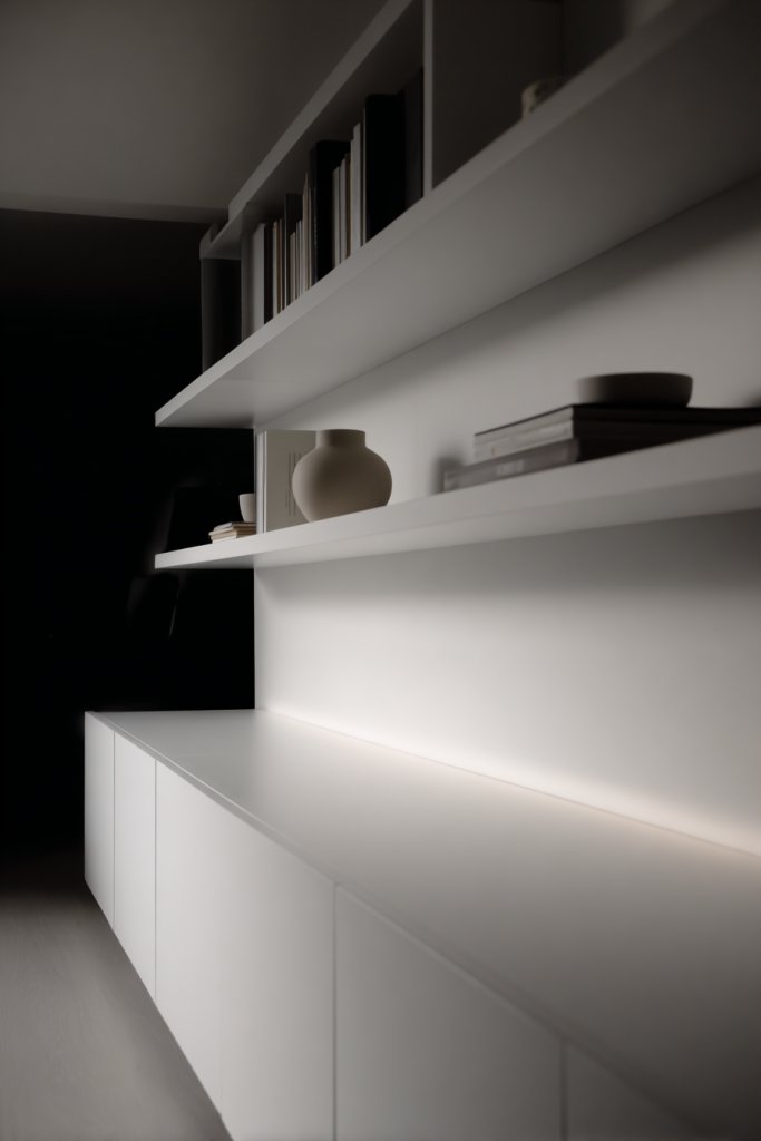 Imagine a wall covered in sleek panels that slide smoothly to reveal hidden compartments or open shelves. The panels can be customized to match your decor—painted, textured, or with decorative finishes. When closed, they create a seamless, minimalist surface; when open, they display electronics or decorative objects. Integrated lighting enhances the effect, making the space look sophisticated and organized.
