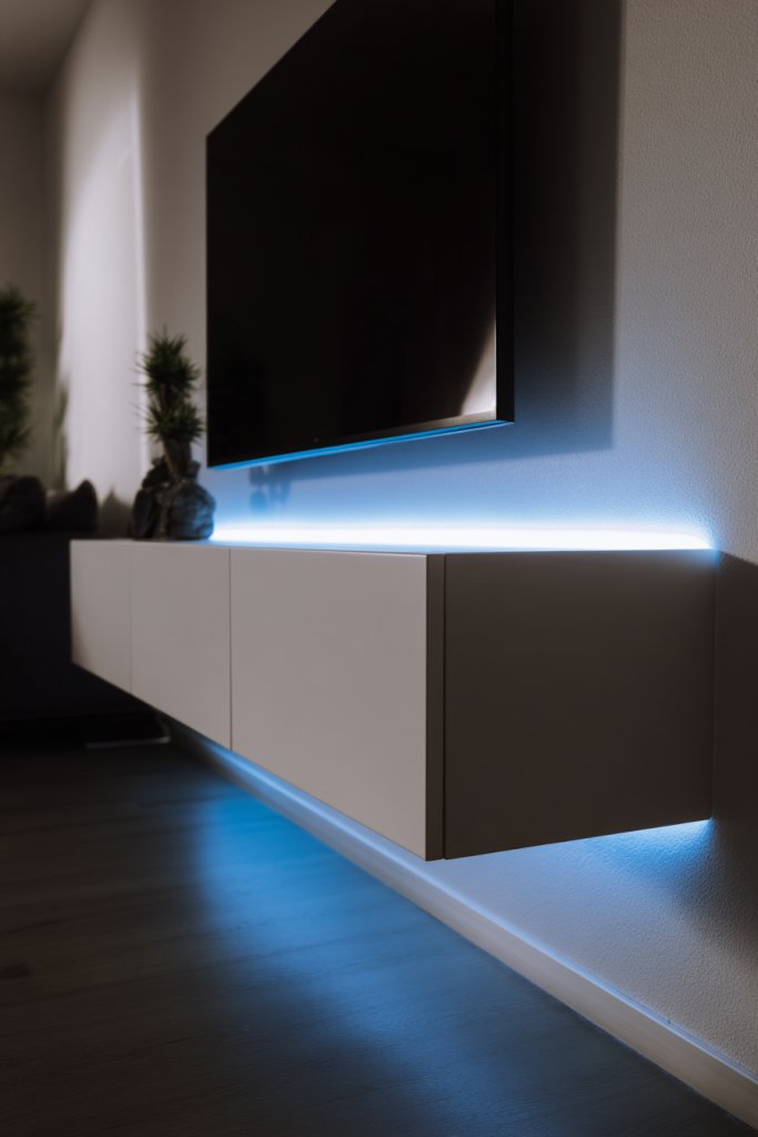 Visualize a slim, wall-mounted console in matte black or white, with a smooth surface for your electronics. Behind the console, hidden LED strips cast a soft glow, highlighting the clean lines and creating an ambient halo effect. The contrast of light and dark emphasizes the minimalist aesthetic, making the space feel bigger and more inviting. The setup appears floating, with no visible cables or clutter.