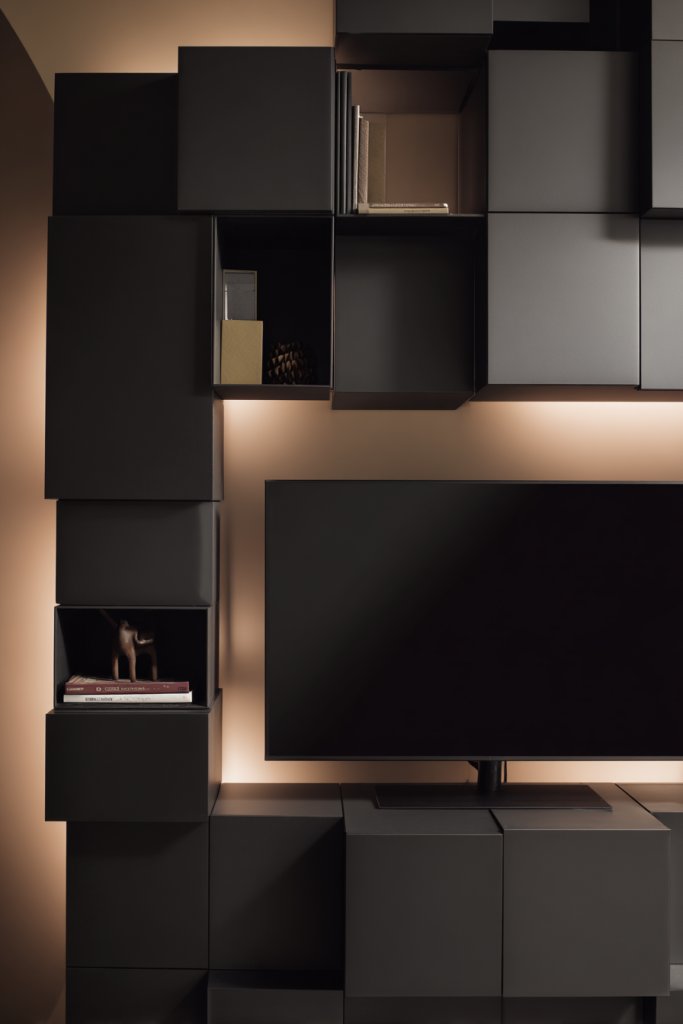 Picture a grid of cube-shaped compartments in a variety of sizes, arranged in a pattern that suits your style. Some cubes are open for display, others are closed with doors or drawers. Materials range from painted MDF to wood veneer, with options for different finishes. The arrangement creates a dynamic, geometric pattern that adds visual interest and depth to your wall. When lit subtly, the cubes cast interesting shadows, emphasizing their modularity.