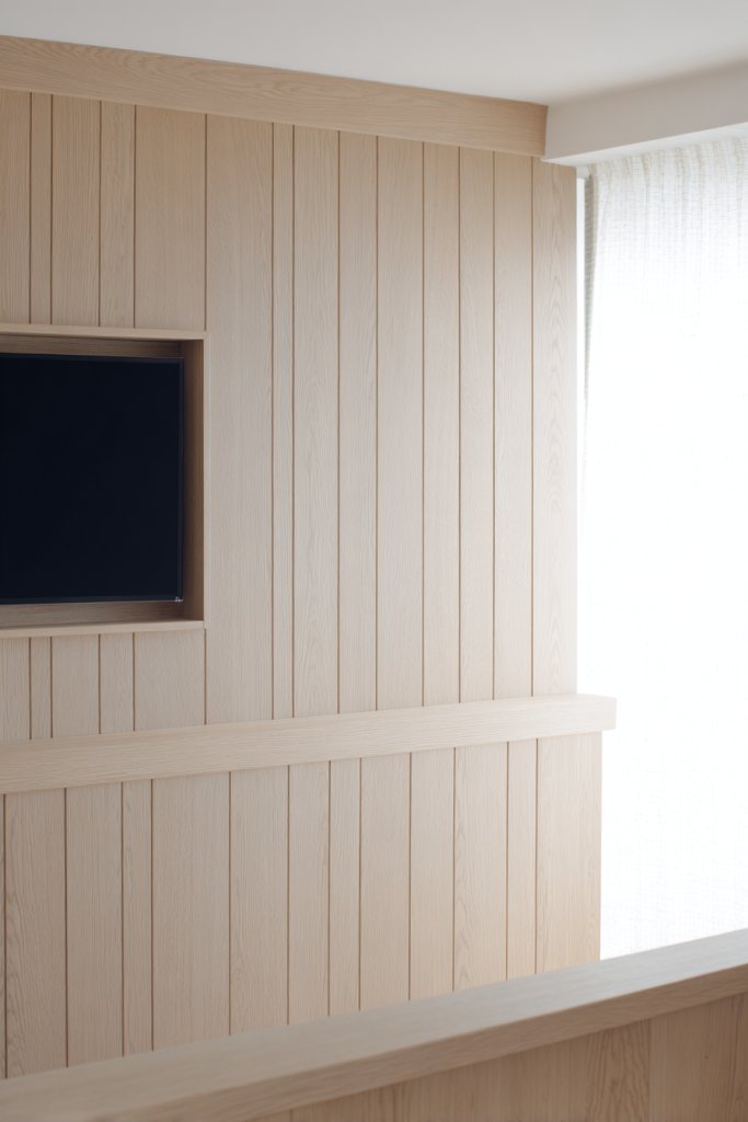 Imagine soft, pale wood panels arranged in horizontal or vertical patterns across your wall. The light finish reflects natural light, making the room feel larger and brighter. When paired with open shelving or hidden storage, the overall look is airy yet functional. Textured fabrics and plush throws nearby add softness, balancing the sleek wood tones perfectly. The subtle grain and matte finish create a calming, Scandinavian aesthetic that feels both fresh and timeless.