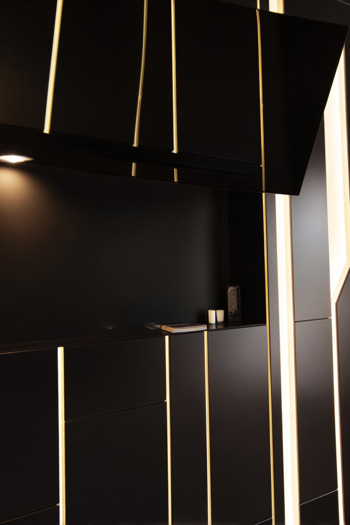 Choose durable matte black paint or panels designed for wall applications. Prepare the wall surface carefully, cleaning and priming for smooth application. Use painter’s tape and high-quality brushes or rollers for a flawless finish. Install contrasting light-colored doors or panels with hidden hinges for a seamless look. Add LED backlights or spotlights to emphasize the contrast and create a layered lighting effect. Keep cables hidden to preserve the sleek aesthetic.