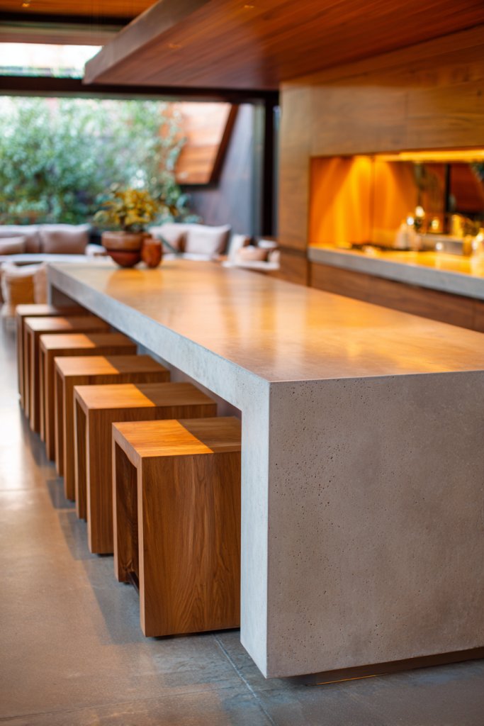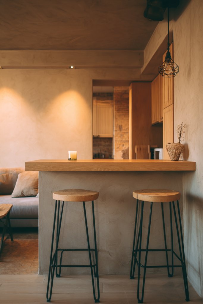 Choose materials like reclaimed wood for rustic charm or glossy quartz for a modern touch. Add decorative accents like textured textiles on the stools or a colorful placemat to personalize the space. During warmer months, replace cushions with bright, breathable fabrics. This setup works well in open-concept homes or small apartments wanting a social focal point.