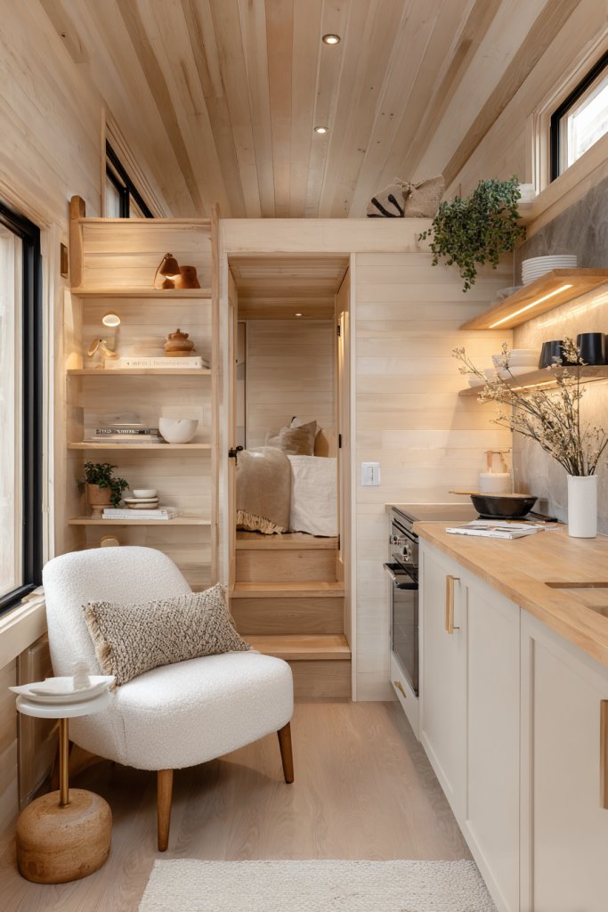 Envision a small, efficient kitchen with streamlined cabinets and open shelves displaying stylish dishware. Adjacent is a plush armchair or loveseat with textured throws, creating an intimate lounge. Warm lighting and soft textiles invite lingering conversations. The layout encourages mingling, making the most of every inch.