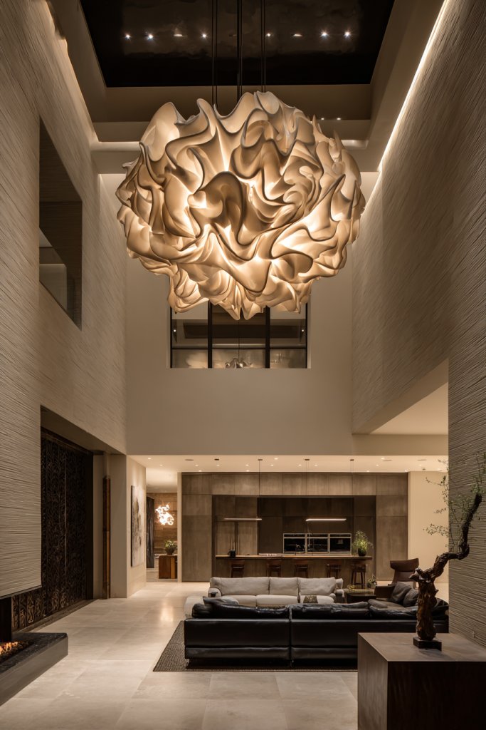 Imagine oversized pendant lights hanging over your dining table or a sculptural chandelier illuminating your lounge area. The lighting draws attention and creates visual anchors, while the rest of the space remains airy and uncluttered. Warm, adjustable bulbs cast a welcoming glow, emphasizing the room’s best features.