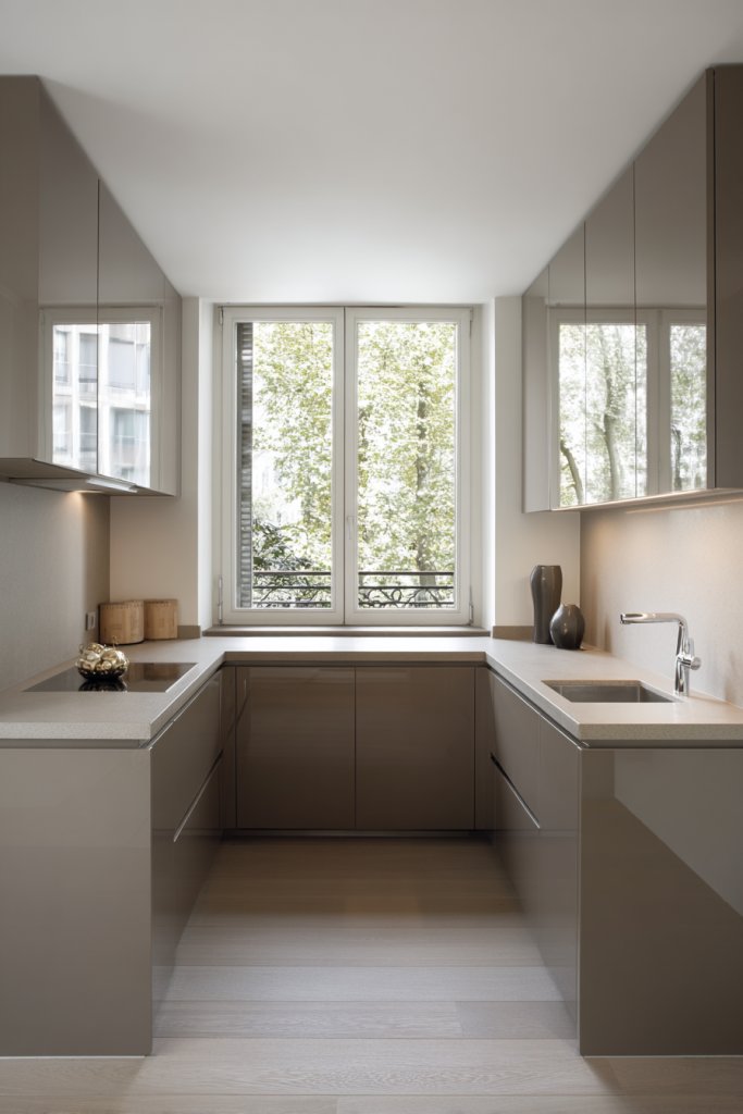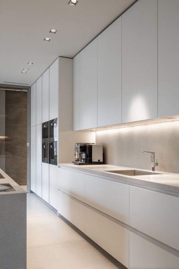 Choose high-quality, built-in appliances that match your cabinetry. Design cabinetry with push-to-open mechanisms to avoid handles and hardware. Use textured finishes or matte surfaces to reduce glare. Install under-cabinet lighting to illuminate work areas subtly. Keep countertops clear by storing small appliances in dedicated cabinets or drawers.