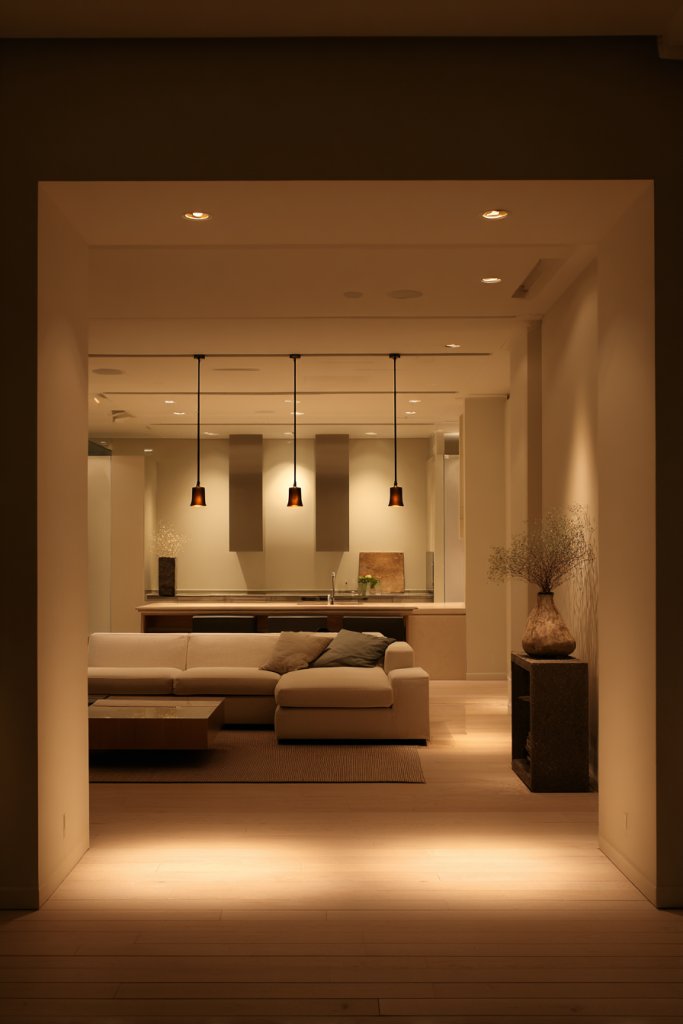 Ever felt your open space is too bland or lacks mood? Layered lighting using pendant and recessed fixtures creates a warm, inviting ambiance while highlighting different zones. It makes your home feel cozy and stylish, perfect for entertaining or relaxing.