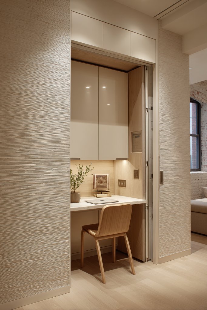 Imagine a sleek, built-in desk tucked into a corner behind a sliding or fold-out door. The surface matches your cabinetry, creating a seamless look. When not in use, it disappears into the wall, maintaining the open, social vibe. The space is illuminated with task lighting, and nearby shelves hold essentials or decor that reflect your personality.