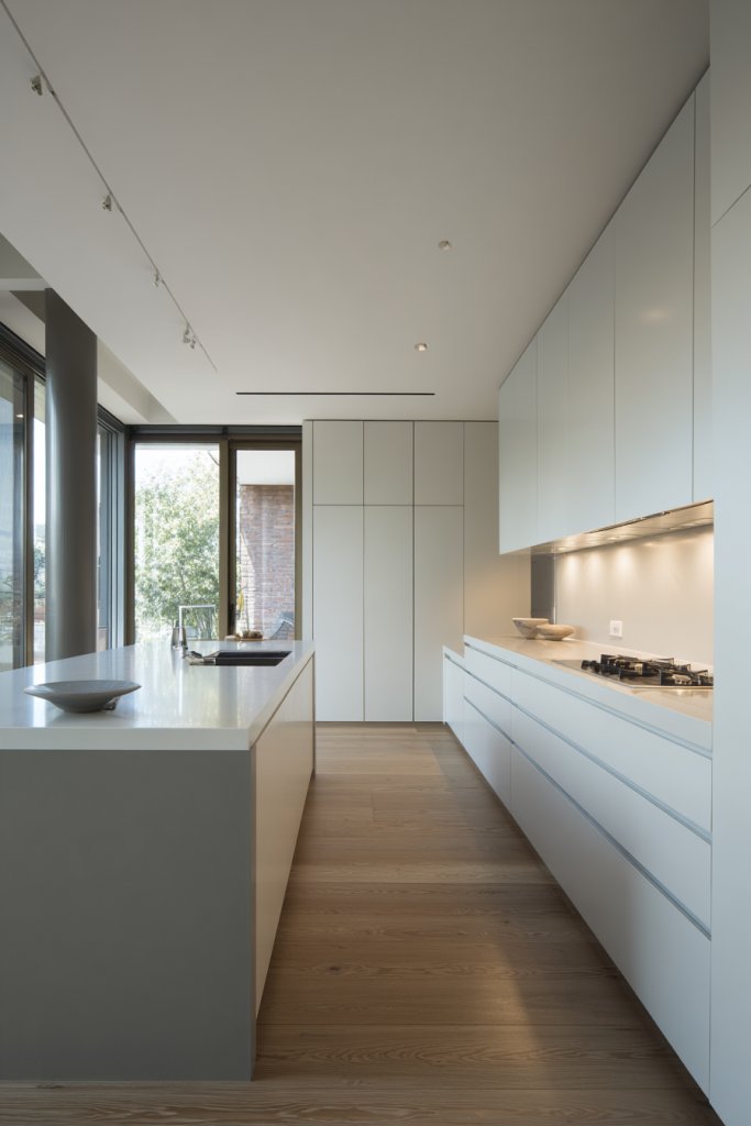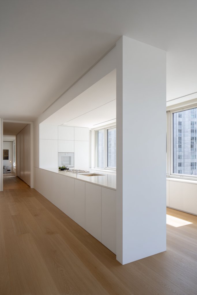 16. Minimalist Design with Hidden Appliances for a Clean, Social Space