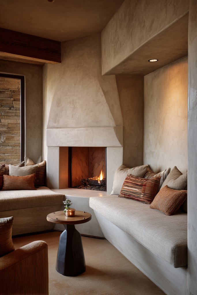 Imagine a modern, wall-mounted fireplace framed by textured tiles or a sculptural surround. Nearby, a pair of plush armchairs or a small sofa create a perfect nook for relaxing. Soft lighting and textured textiles like a faux fur throw or velvet cushions enhance the cozy vibe. The glow of the fire adds warmth and ambiance.