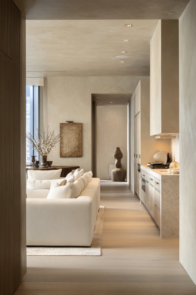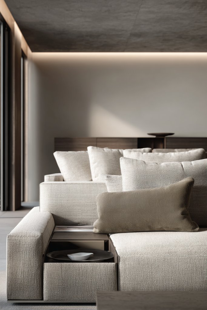 Visualize a kitchen with integrated appliances concealed behind flat-front cabinetry. The surfaces are uncluttered, with only a few essential items on display—like a soft cream throw blanket with chunky knit texture or a sculptural fruit bowl. The color palette is neutral, with textured finishes adding depth. Soft lighting enhances the minimalist aesthetic.