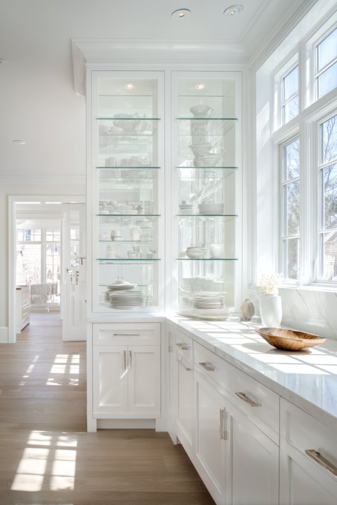Visualize glass-front cabinets displaying neatly arranged dishes, glasses, or decorative items. The transparency adds depth and prevents the space from feeling heavy or closed off. The surrounding cabinetry has sleek, minimalist hardware, emphasizing openness. Soft lighting inside highlights your collection and adds warmth.