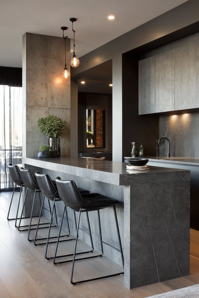A continuous countertop ties your social zones into one harmonious space. It boosts your confidence in creating sleek, modern interiors. The result is a home that feels open, connected, and stylishly functional.