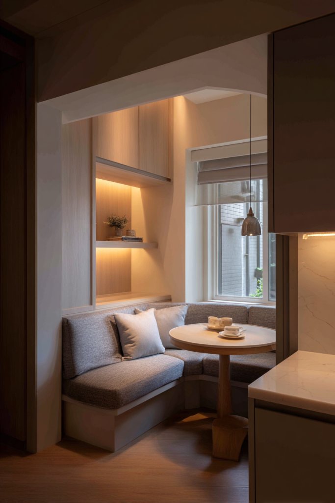 Imagine a built-in bench with plush cushions along a corner wall, paired with a small round table. The space is framed by large windows that flood it with natural light, creating a cheerful atmosphere. Simple, streamlined cabinetry or open shelving nearby keeps everything accessible. Textured textiles and soft lighting complete the cozy vibe.
