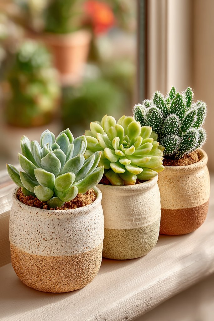 Decorate pots with subtle carvings or painted accents for a personalized touch. Use minimalist labels or tags to identify different species. Incorporate decorative stones or sand for added texture. Arranged in groups, they create a mini oasis that’s both stylish and calming.