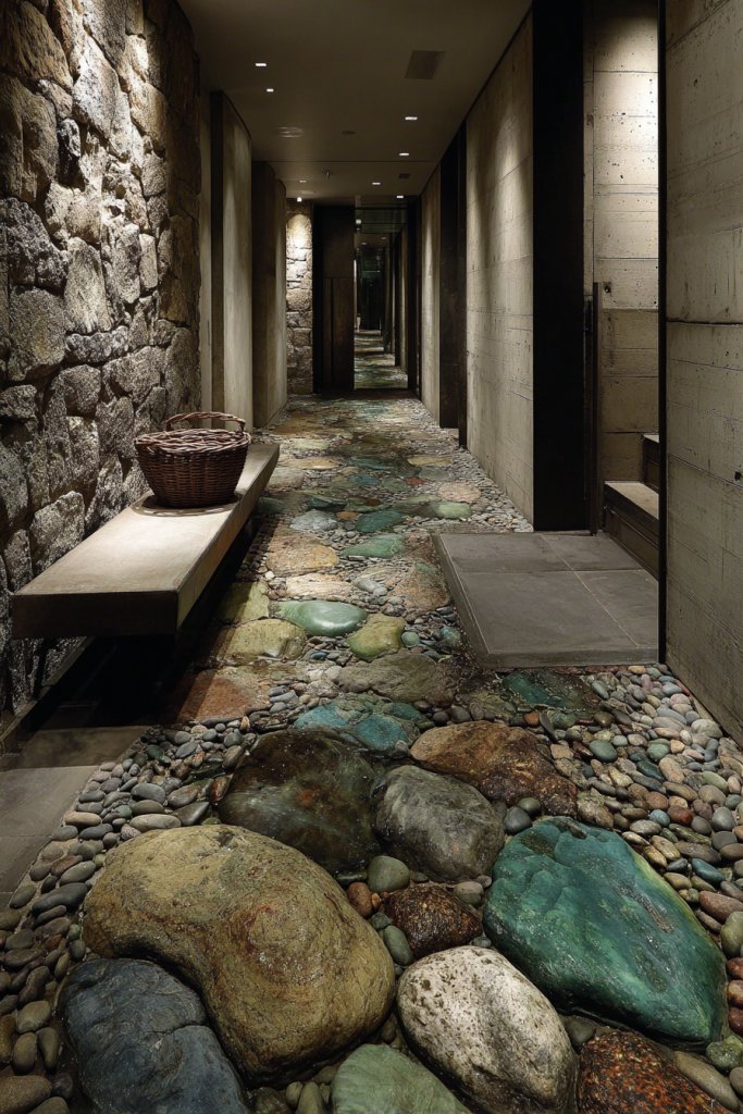 13. Incorporate Natural Stone or Pebble Accents in Entryways or Bathroom Surfaces