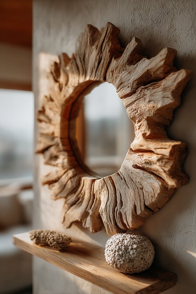Imagine a mirror with a rough, sanded edge in light, natural wood leaning against a wall or mounted simply with minimal hardware. The unpolished finish highlights the natural grain and imperfections, adding character. Pair with monochrome or earthy-toned photographs or prints for a cohesive look that feels genuine.