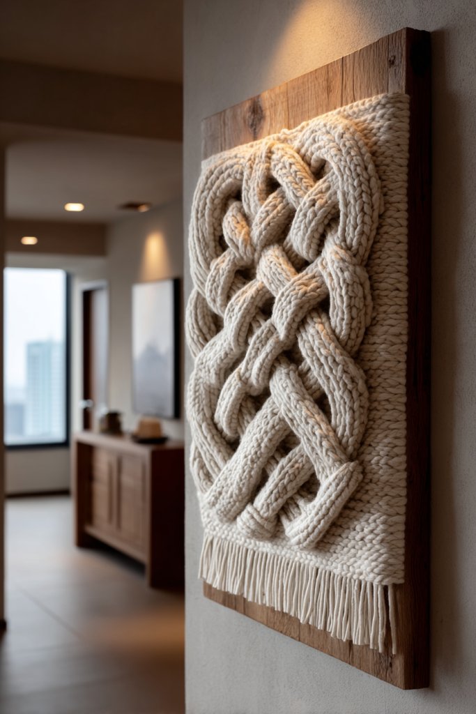 Create a gallery wall with different sizes and styles of woven or knotted pieces. Use neutral colors for a calming effect, or incorporate subtle dyes for a pop of muted color. Mix with other organic elements like wooden accents or textured cushions. Change or add new hangings seasonally for fresh appeal.