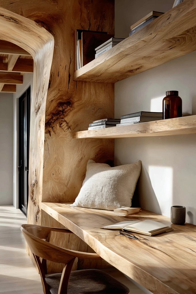 Add personality with handcrafted wooden accessories or light-colored ceramics. Incorporate open shelving made from reclaimed wood for displaying functional items like baskets or neatly folded textiles. Keep clutter minimal to maintain the clean aesthetic, but don’t be afraid to add a few statement pieces like sculptural wooden accents.