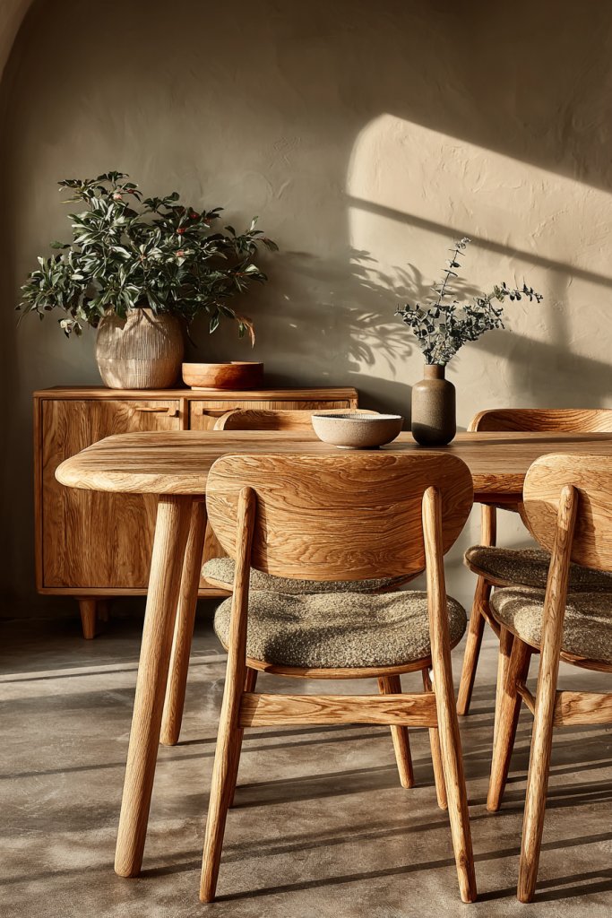 Visualize a sleek dining table with smooth, pale oak or ash finishes paired with simple chairs. The natural grain adds texture that elevates the overall aesthetic. These pieces reflect sunlight and make the room feel open and airy. The minimalist design emphasizes form and function, making your space feel effortlessly organized and calming.