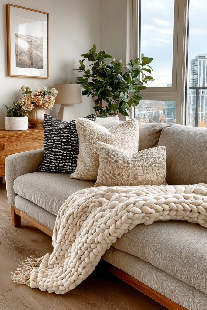 Imagine a plush, cream or taupe throw blanket with chunky knit or woven textures casually draped over a sofa or armchair. Pair with similarly textured cushions in natural fabrics—cotton, linen, or wool—for a balanced look. These tactile layers draw the eye and invite touch, adding warmth and depth.