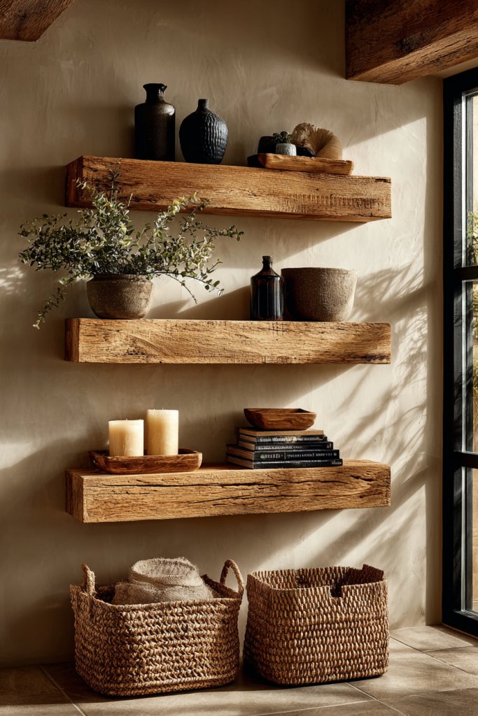 Picture a set of thin, natural wood floating shelves mounted on a neutral wall. They hold baskets, candles, or artisanal ceramics—nothing overly ornate, just simple, functional beauty. Their clean lines and warm textures create a balanced, airy look that complements organic decor. Light plays softly across the wood, highlighting its grain.