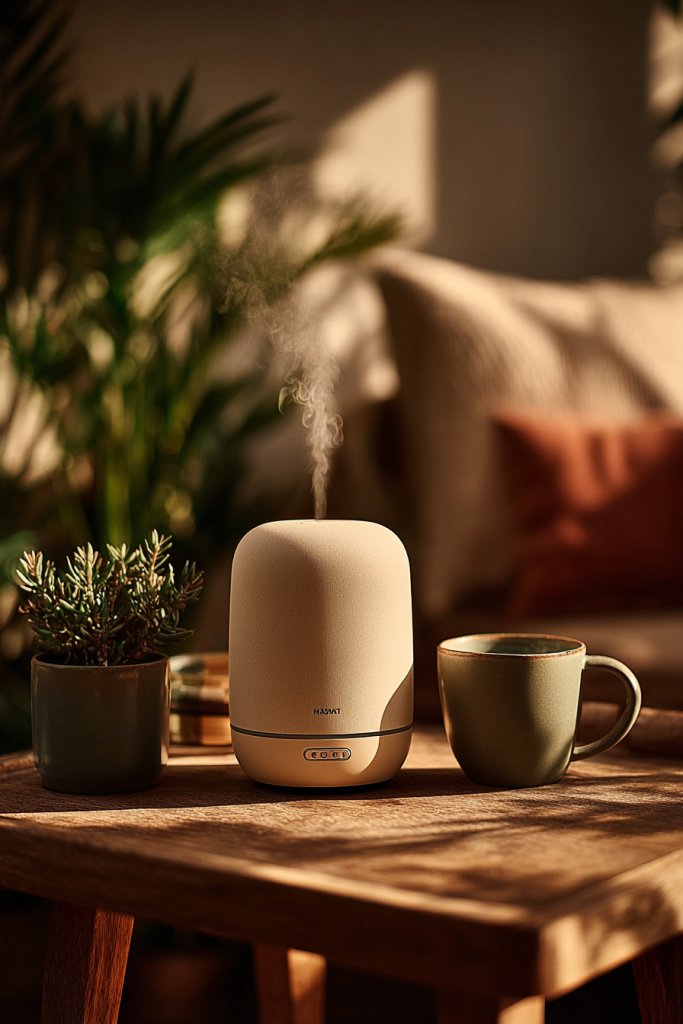 Imagine a simple, ceramic or wooden diffuser on a shelf or side table, softly emitting fragrant vapors. The neutral, matte finish blends seamlessly with organic textures and earthy tones. When combined with textiles and natural materials, the gentle scent completes a serene, holistic environment.