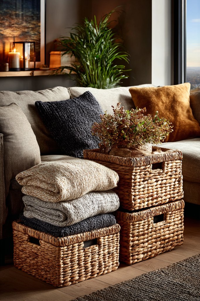 Imagine baskets and boxes made from warm-toned rattan stacked neatly in a corner. Their intricate weaves add visual interest and texture to your room. These natural materials soften the look of modern furniture, creating a balanced, inviting environment. When filled with throws, magazines, or small accessories, they serve both form and function.