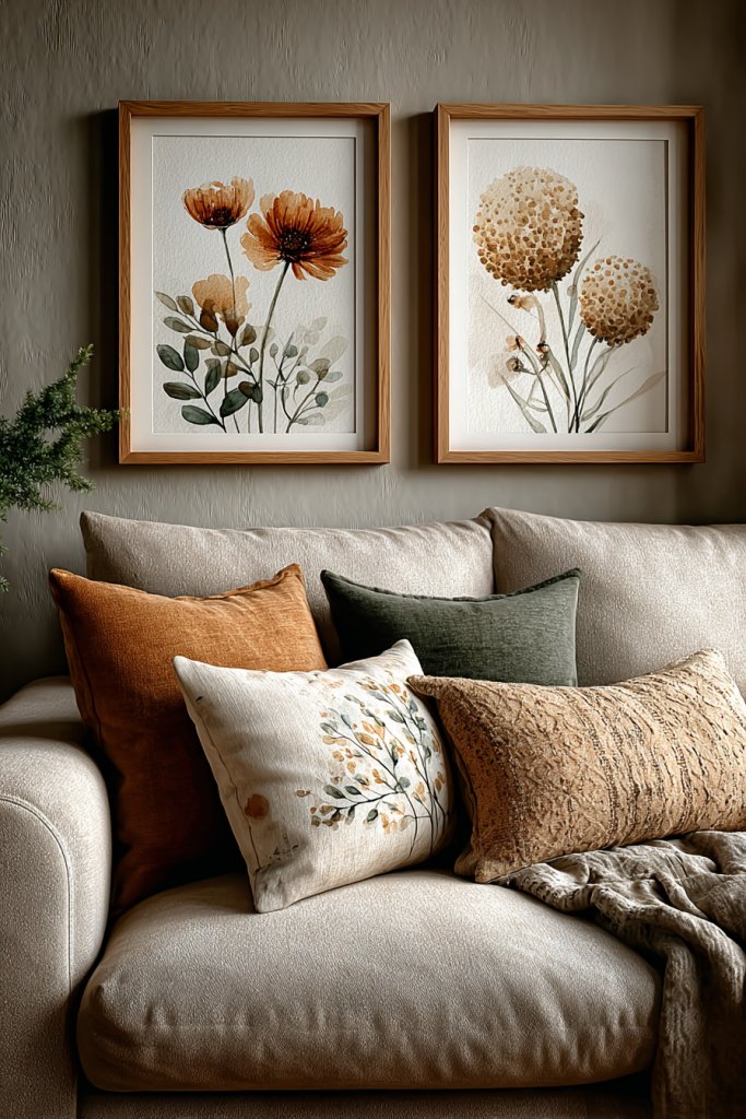 6. Hang Minimalist Wall Art Featuring Earthy Colors and Abstract Nature-Inspired Designs