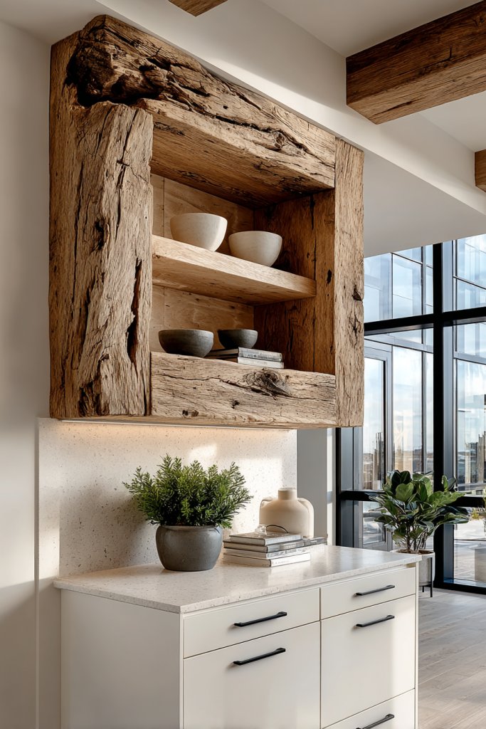 7. Opt for Open Shelving Made from Reclaimed Wood to Showcase Decorative Items