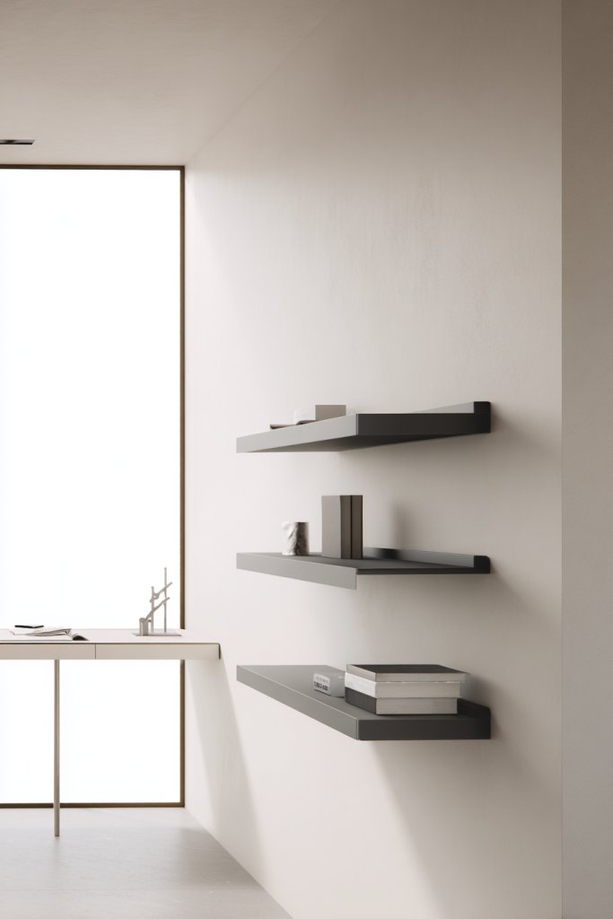 Imagine a set of slim, matte-finished shelves mounted high on a wall, holding everything from books and picture frames to decorative boxes. The open design creates a sense of openness, while the floating effect keeps everything looking airy and modern. Soft lighting accents the shelves, casting gentle shadows that add depth and warmth. The textures of the materials—metal, wood, or glass—play with light, making your space feel alive.