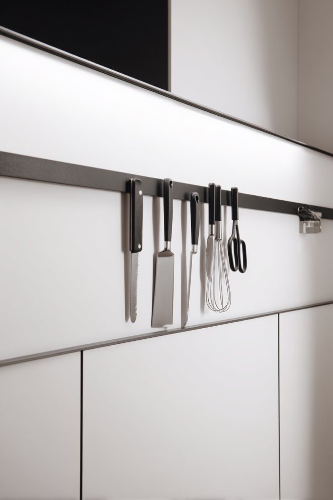 Picture a long, slim magnetic strip mounted on a backsplash or wall, holding knives, scissors, or small metal tools securely in place. The shiny metal contrasts with your wall color, creating a stylish display. The tools are always visible and accessible, eliminating the need to dig through drawers. It’s both functional and minimalist, perfect for busy mornings or craft sessions.