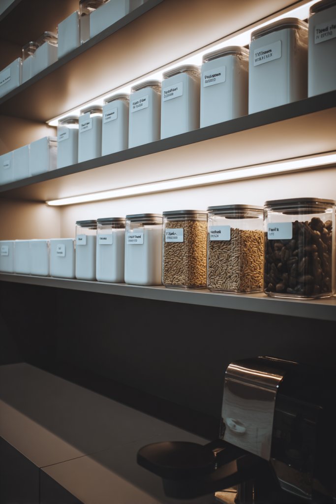 Clean and dry your storage area before organizing. Fill containers with your items and label each one clearly. Arrange containers by size or category for easy access—place the most-used at eye level. Regularly review and refill to prevent shortages or expired items. Use stackable jars or racks to optimize space in cabinets or on counters.
