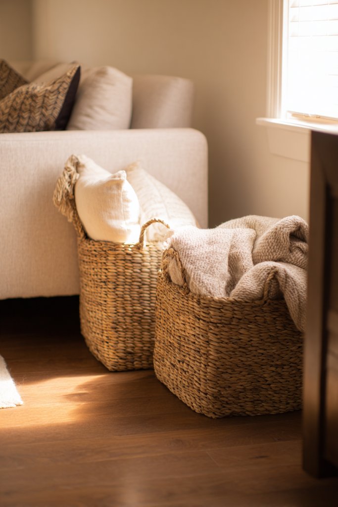 6. Add Decorative Baskets for Stylish Storage in Living Rooms and Bedrooms