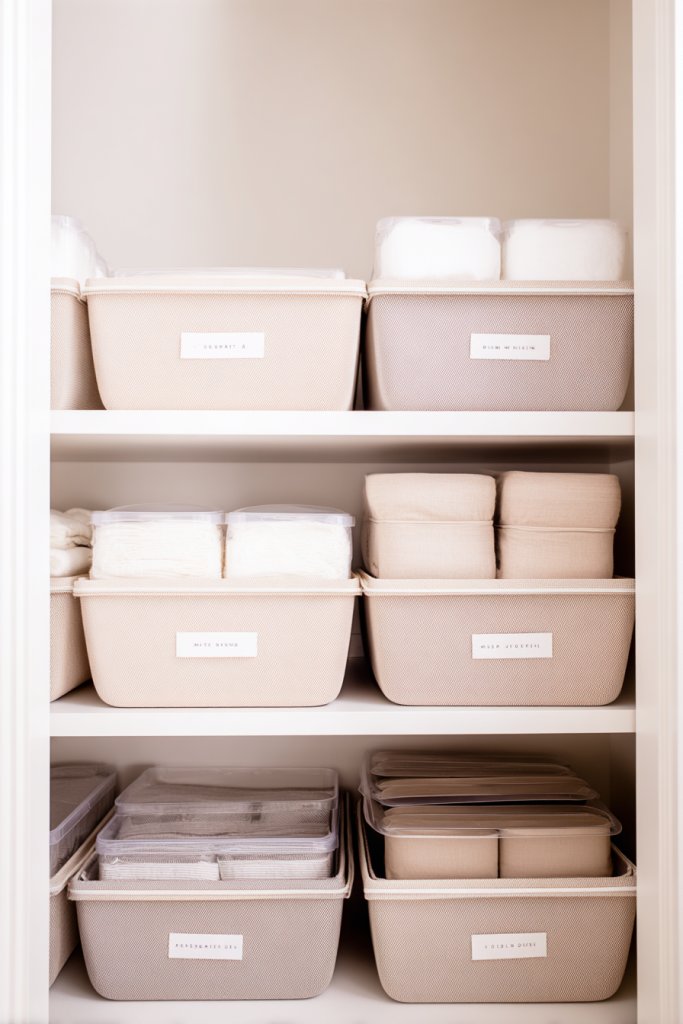 Empty your closet or pantry area and categorize items. Select bins that fit your space and item size. Label each container clearly for quick retrieval. Stack the bins efficiently to prevent overhanging or unstable setups. Regularly review and purge to maintain a clutter-free environment. Use shelf risers or tiered systems for even better space utilization.