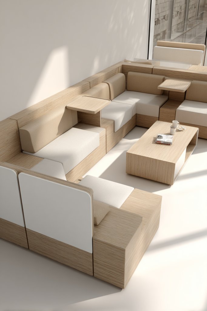 Picture a set of cubes or sections that can be combined into a sofa, bed, or workspace. The pieces are made of lightweight yet sturdy materials, with sleek finishes in neutral or bold colors. You can slide, stack, or rearrange them in seconds, creating different zones for lounging, sleeping, or working. The look is modern and minimal, with clean lines and versatile textures. It’s like building your perfect space with blocks.