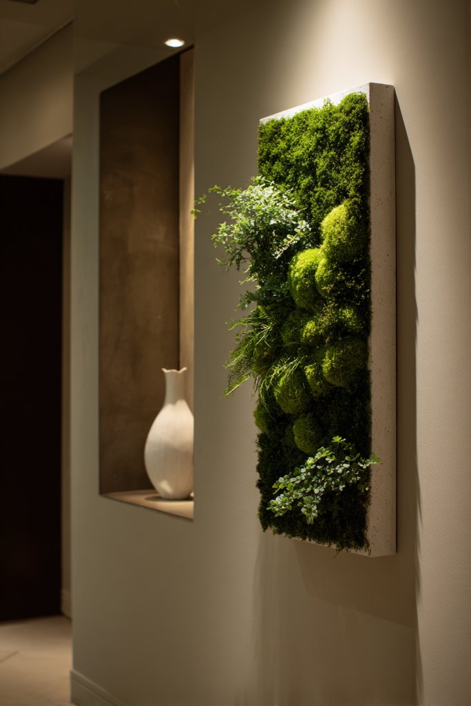 Choose from various styles—living walls with real plants, fabric-covered panels, or geometric faux plant arrangements. Mix different textures and shades of green for a natural look. Incorporate decorative containers or frames that match your decor style—industrial, boho, or modern. Seasonal swaps or updates keep the look fresh and lively.