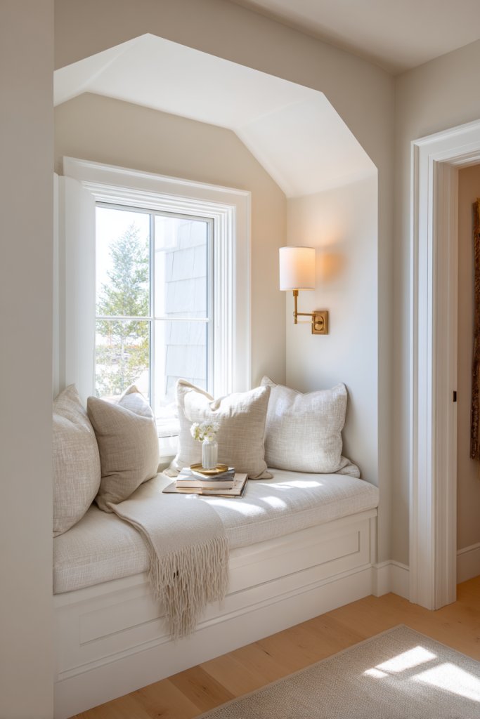 Visualize a small, cushioned armchair or built-in bench with plush textiles and a soft throw. The corner is defined with a small rug and perhaps a floating shelf or wall-mounted light for ambiance. Decorative pillows in contrasting colors or textures add comfort and style. The space feels intimate and inviting, perfect for quiet moments or casual chats. It transforms a neglected corner into your favorite retreat.
