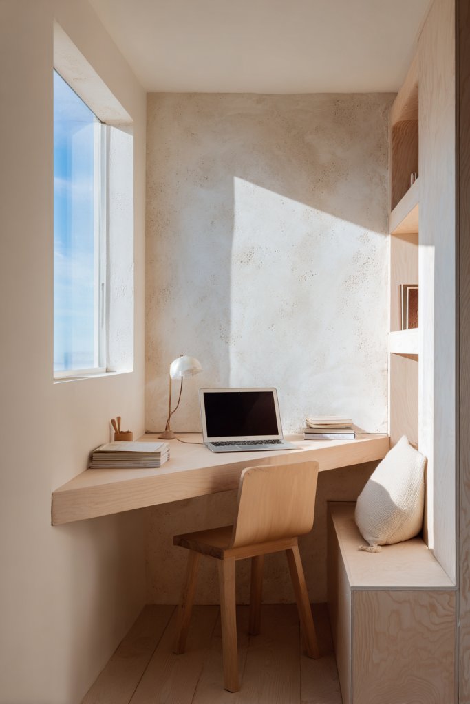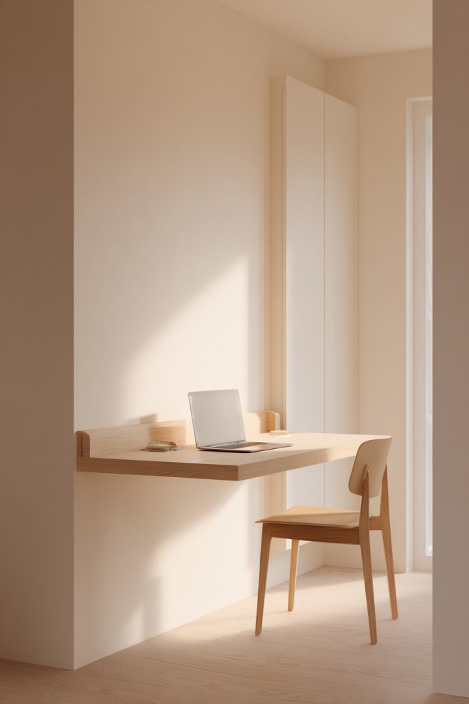 Imagine a slim, wall-mounted desk with a smooth surface in a neutral tone, paired with a comfortable, compact chair. When not in use, it folds up or disappears into the wall, leaving the room open and uncluttered. The setup looks modern and clean, with a seamless integration into your decor. The space feels larger and more organized, with a dedicated station for productivity. It’s like having a hidden work zone that’s always ready.