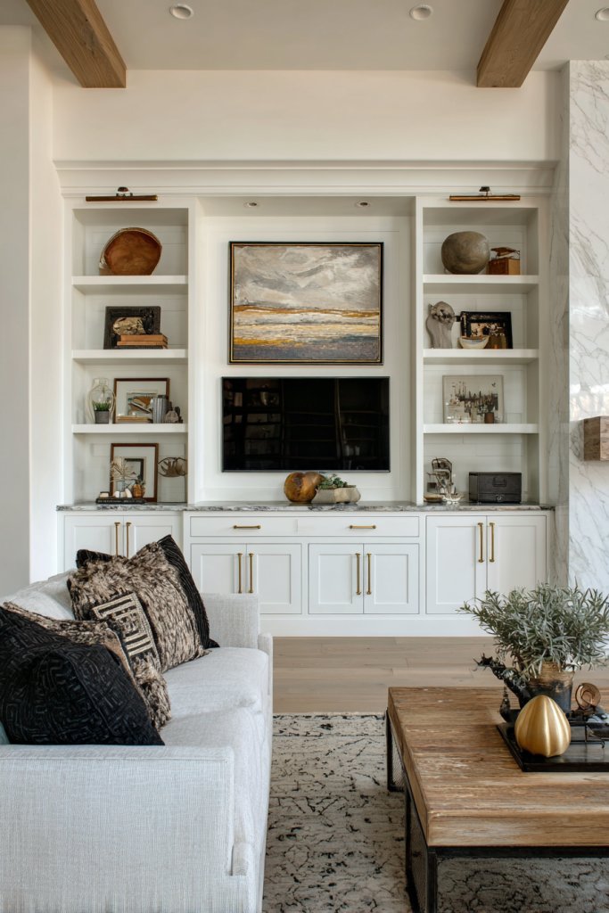 Add personal touches with textured textiles, like a soft cream throw blanket or a chunky knit pillow, to keep the space warm and inviting. Incorporate art or decor in muted tones or abstract designs that complement the simplicity. Use decorative baskets or boxes to hide everyday clutter. Regularly rotate accessories to keep the space feeling fresh and uncluttered.