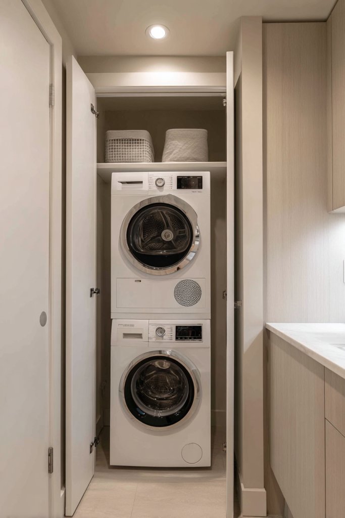 Imagine a slim wall-mounted unit with a stacked washer and dryer, hidden behind sleek cabinet doors. Nearby, a pull-out countertop provides space for folding and sorting, with small baskets or hooks underneath for supplies. The entire setup blends into the room with a cohesive finish, making laundry feel less like a hassle and more like a design feature. The space looks tidy, efficient, and modern.