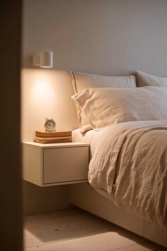Imagine a minimalist, wall-mounted table with a smooth surface in matte black or warm wood finish. It appears to hover effortlessly above the floor, creating a sense of openness. A small shelf or drawer beneath offers storage for essentials like your phone or a favorite book. The setup feels airy and organized, with all the necessary items within arm’s reach but visually unobtrusive. The room immediately feels more spacious and stylish.