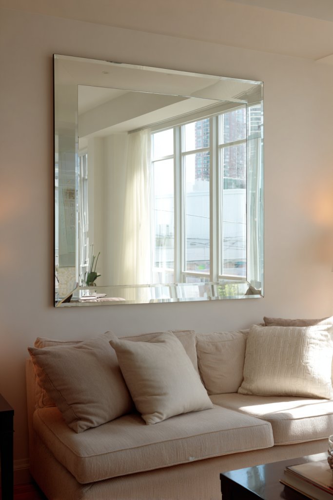 Envision a large, frameless mirror mounted on one wall or a series of smaller, decorative mirrors arranged artfully. The reflection captures natural light from a window or artificial sources, amplifying brightness. The mirror’s surface doubles the visual space, making the room feel twice as big. Decorative frames or textured borders add personality, turning a functional item into a focal point. The overall effect is a room that feels airy, bright, and unexpectedly spacious.