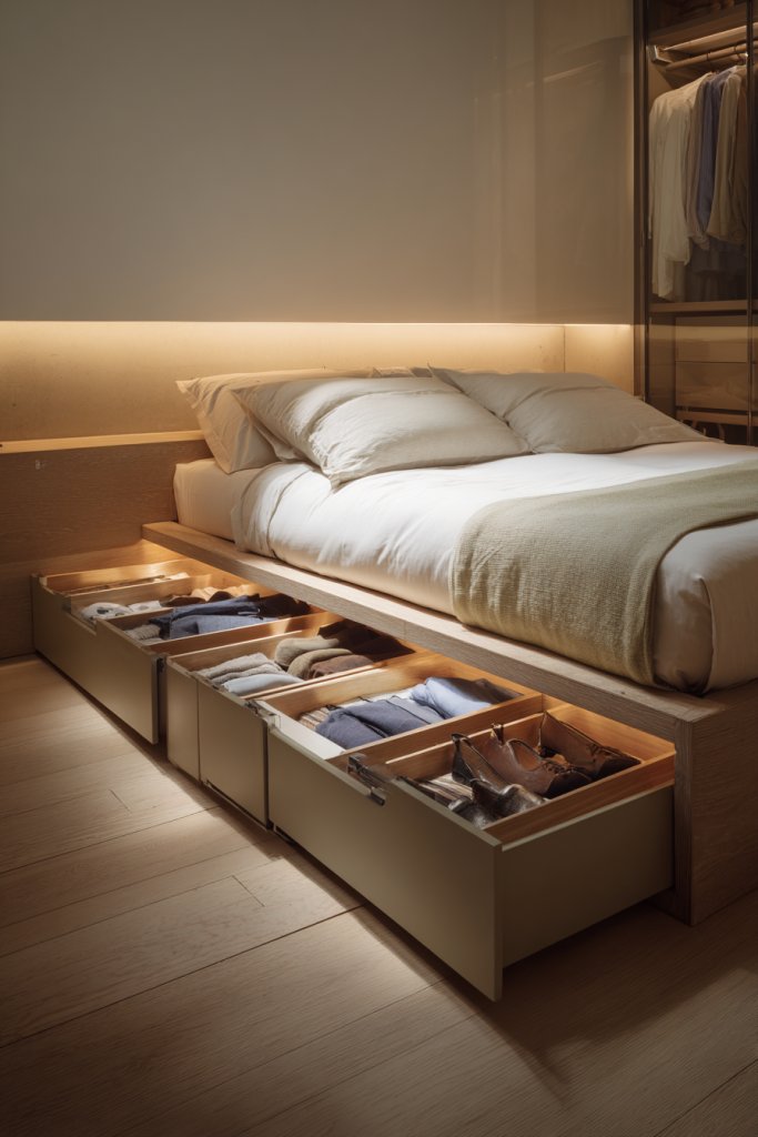 Imagine a low-profile bed frame with spacious drawers or slide-out bins underneath. The lids or doors blend seamlessly with the bed’s fabric or wood finish, keeping clutter out of sight. When you open the storage, you reveal neatly folded blankets, shoes, or off-season clothing—organized and easily accessible. The whole setup looks sleek and tidy, making your room feel larger and more organized.
