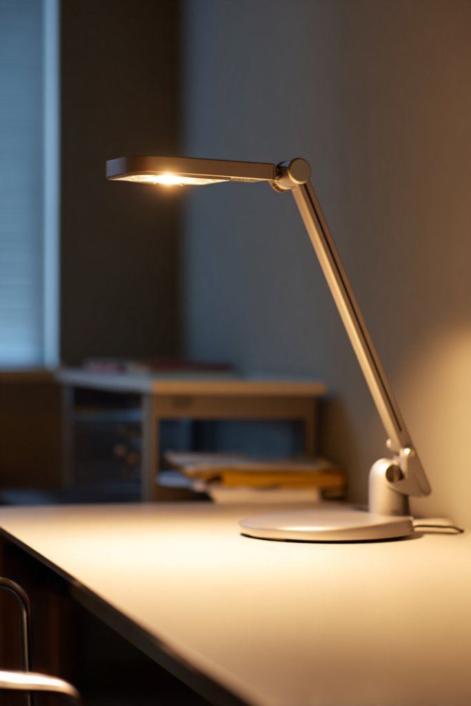 Imagine a sleek, modern desk lamp with a flexible arm and dimming controls, casting a soft, even light across your workspace. The light’s color temperature shifts from warm to cool, mimicking natural daylight or cozy evening tones. The lamp’s matte finish contrasts beautifully with a wood or metal desk, adding a touch of sophistication. As you adjust the brightness, the space feels more inviting and less stressful on your eyes, even after hours of reading or writing.